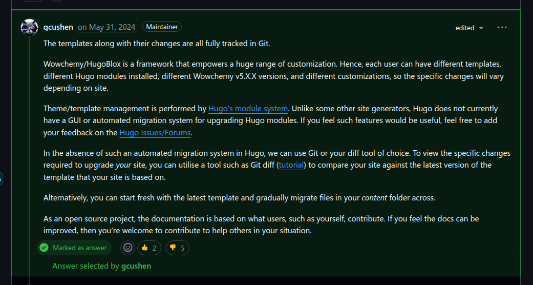 雖然說提供文件和指引不是開發者的義務,但做為 GitHub 上星星數數一數二多的 hugo theme,這樣的穩定度實在是非常勸退我,誰知道什麼時候還會再發生類似的事情,我又得再花多少時間去爬那些 commit?